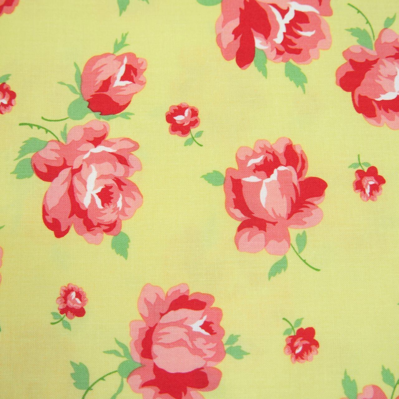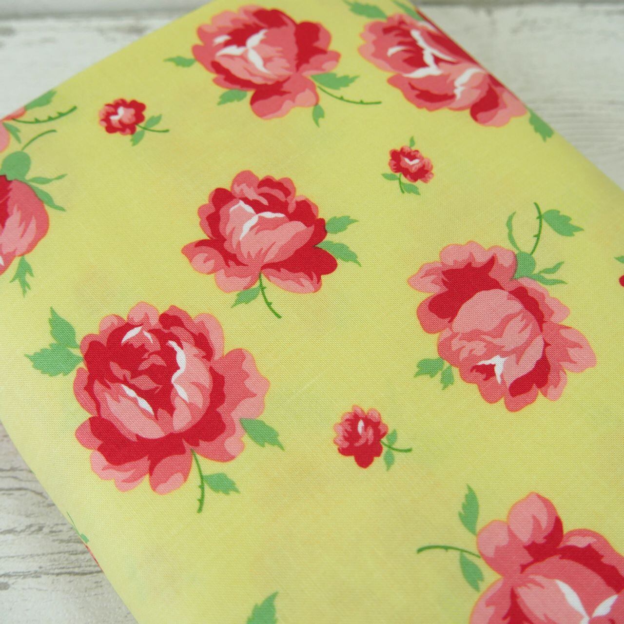 ・moda【サマータイム】から鮮やかな黄色に大きな赤の薔薇模様が美しい生地です