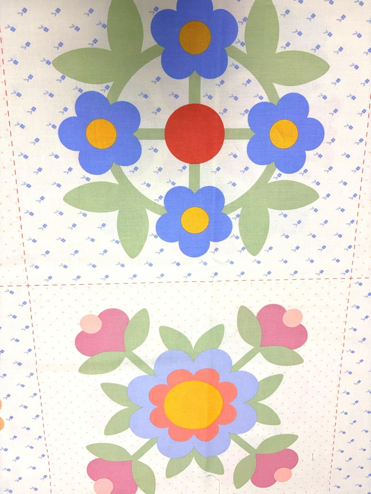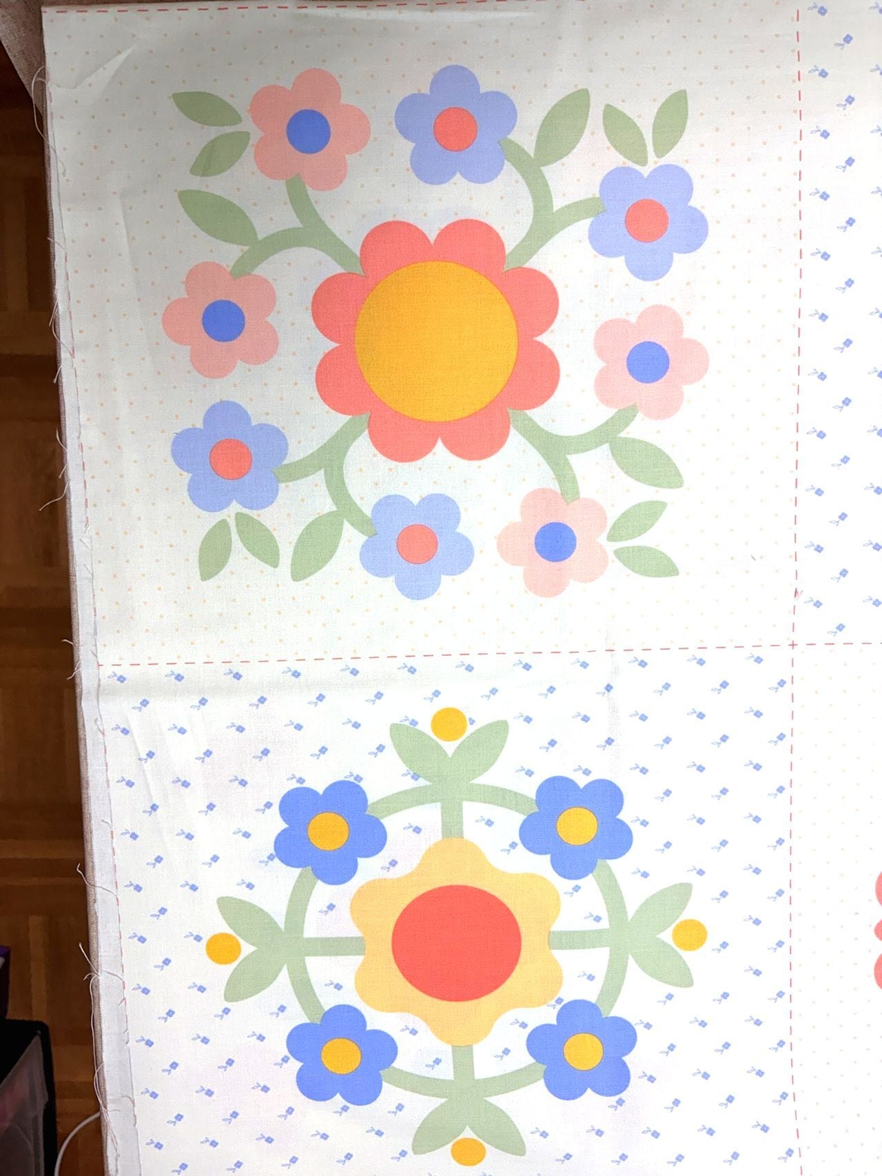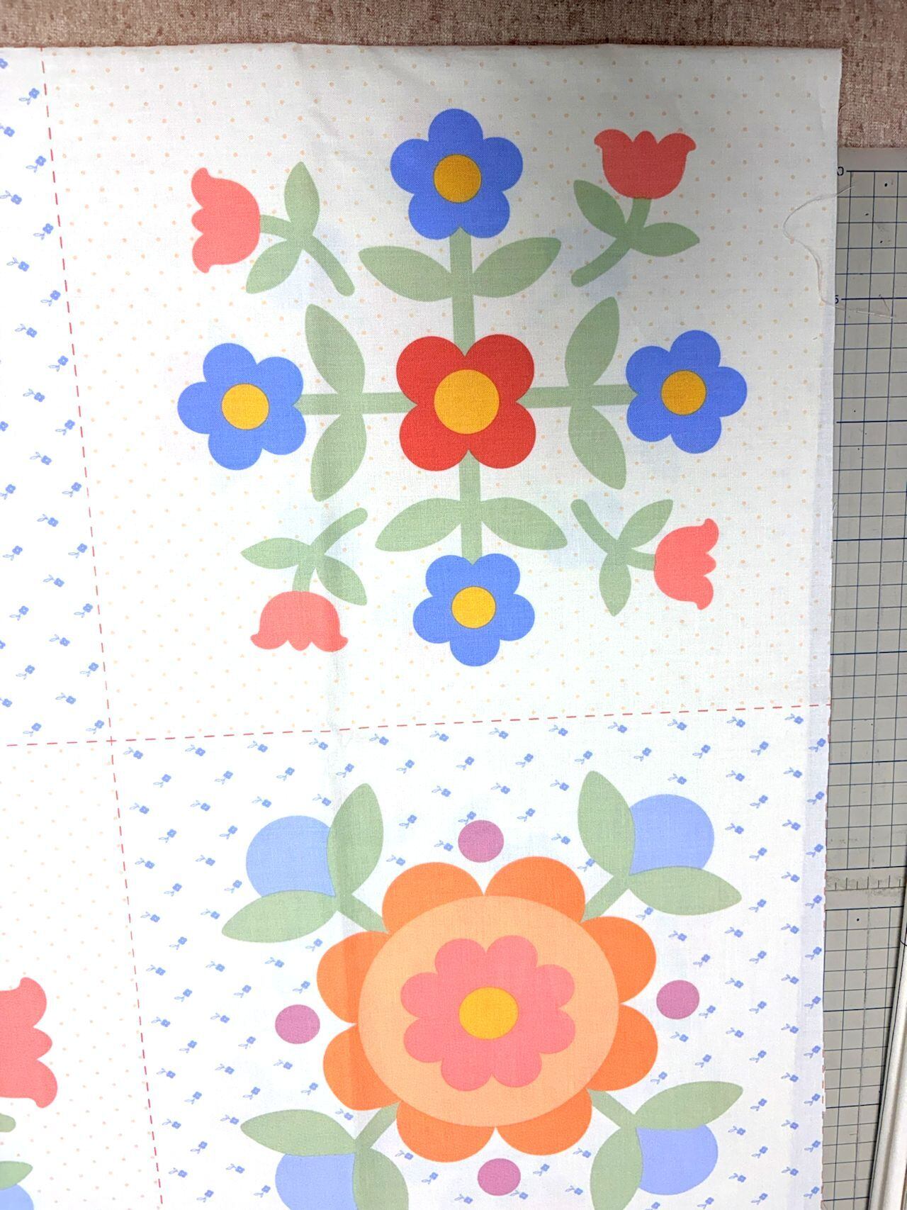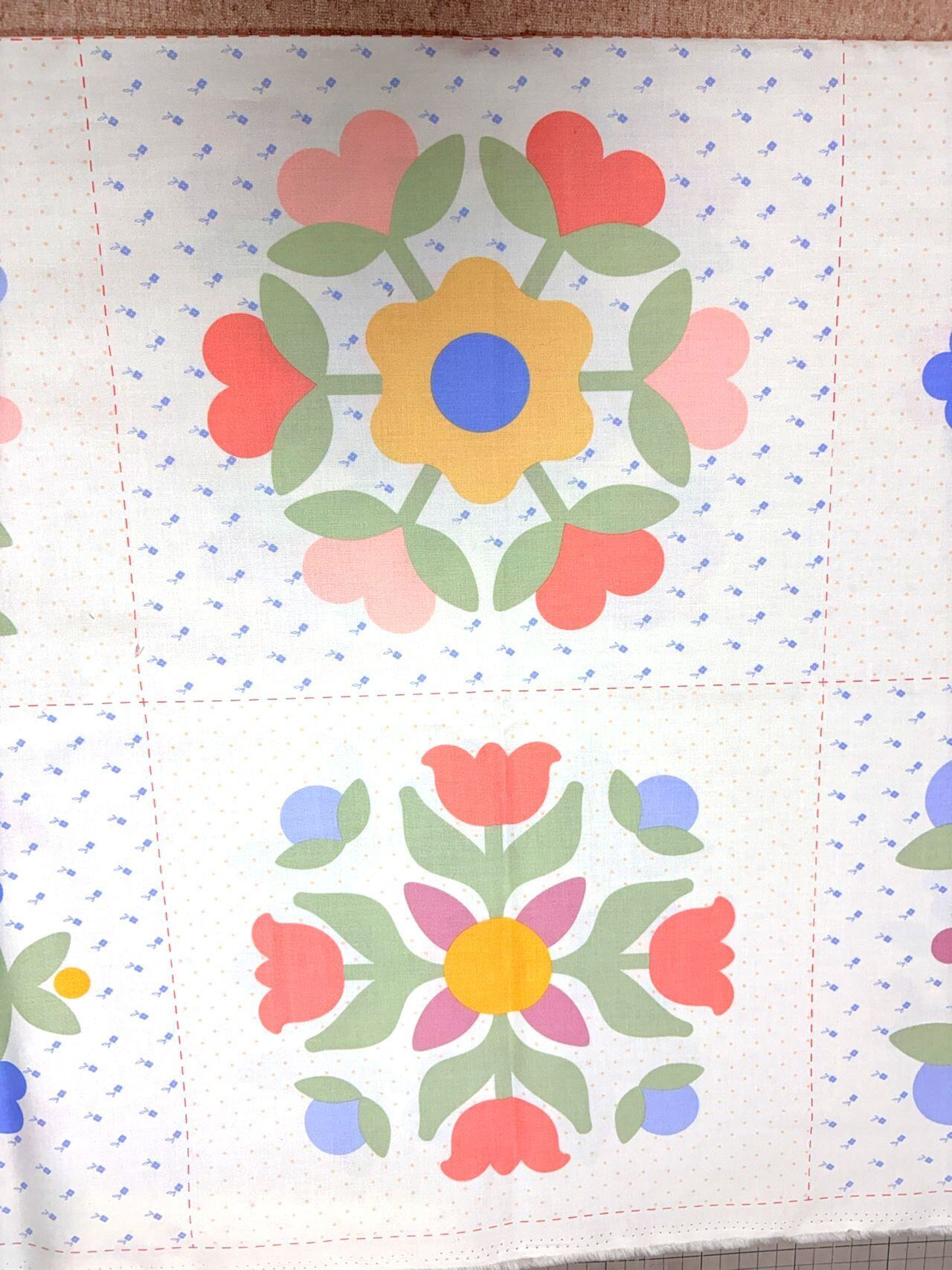 ・90㎝×110㎝のパネル生地の中に、12個のお花のリース模様が描かれています