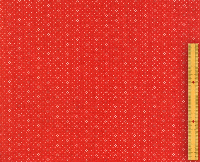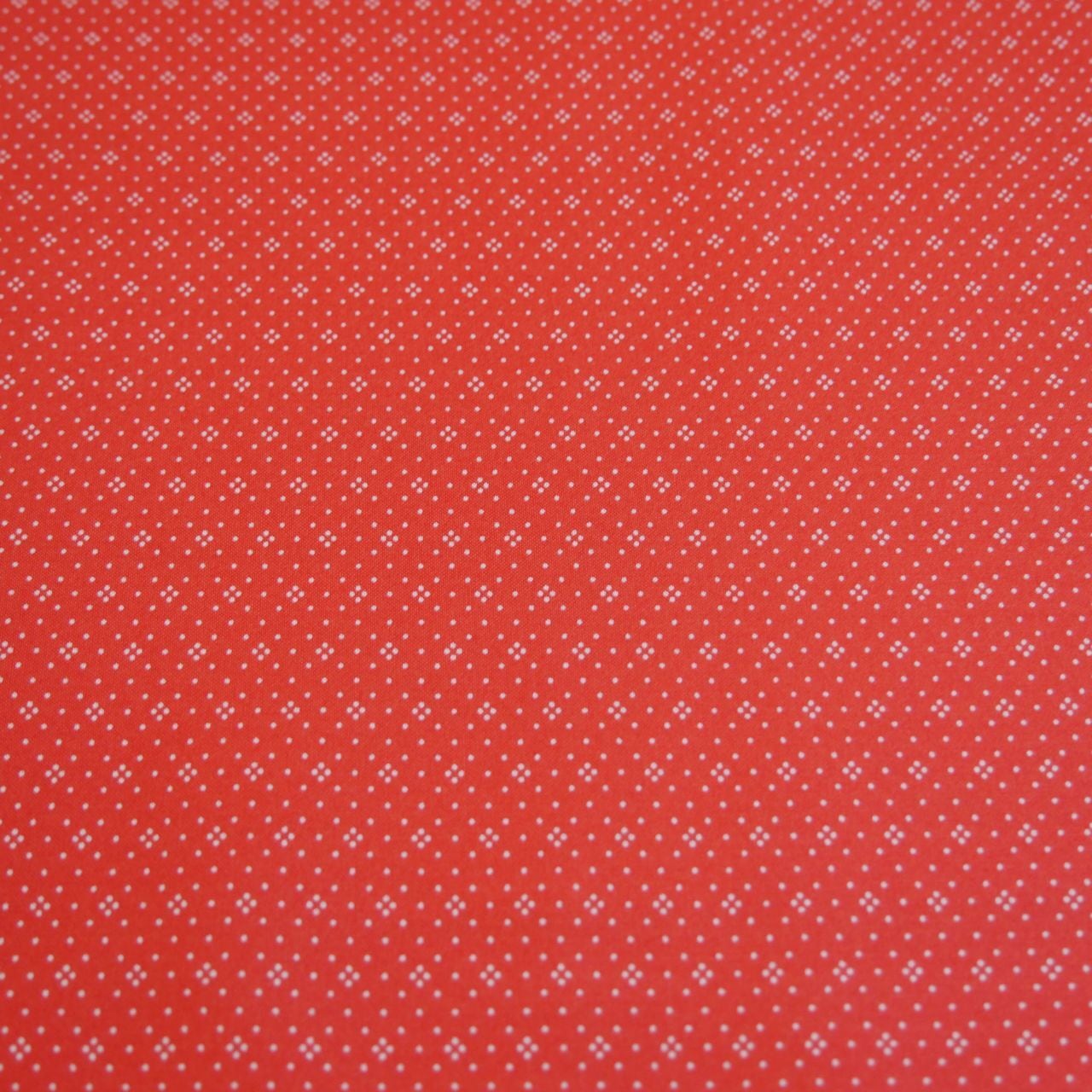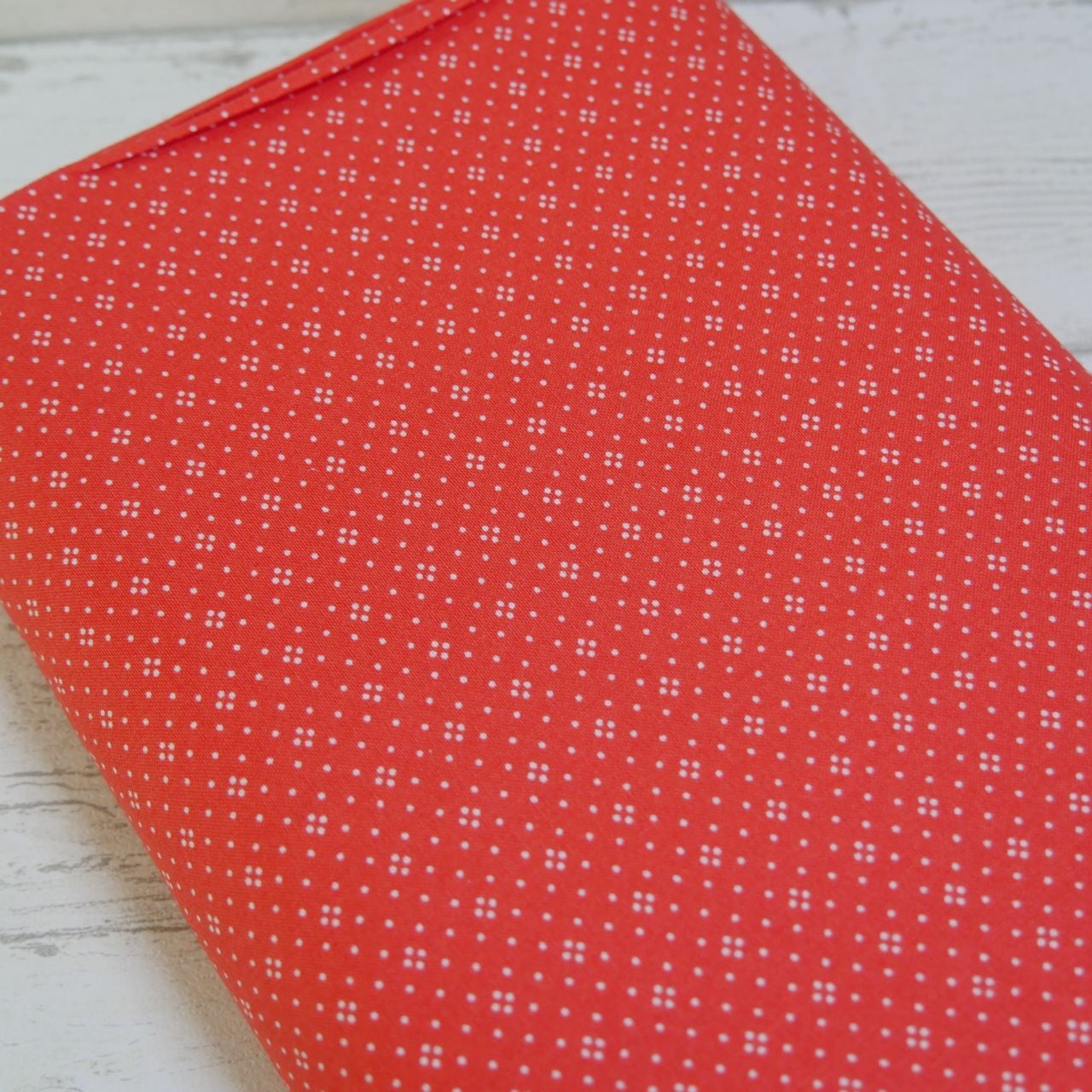 ・朱色×オレンジの土台に小さなドット模様。とての合わせやすい生地です