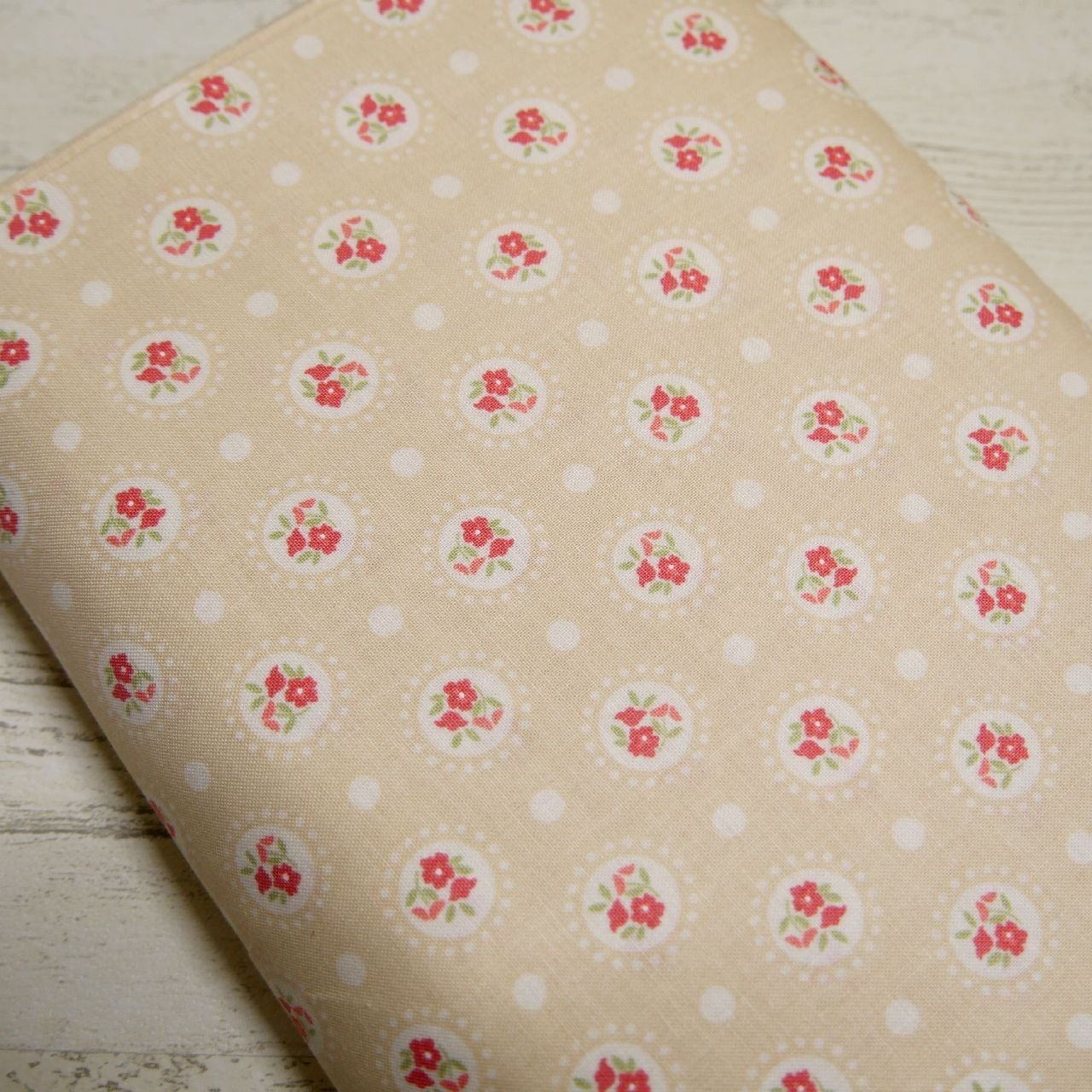 ・ベージュの土台色×サークルの中にお花が描かれたチャーミングな柄です