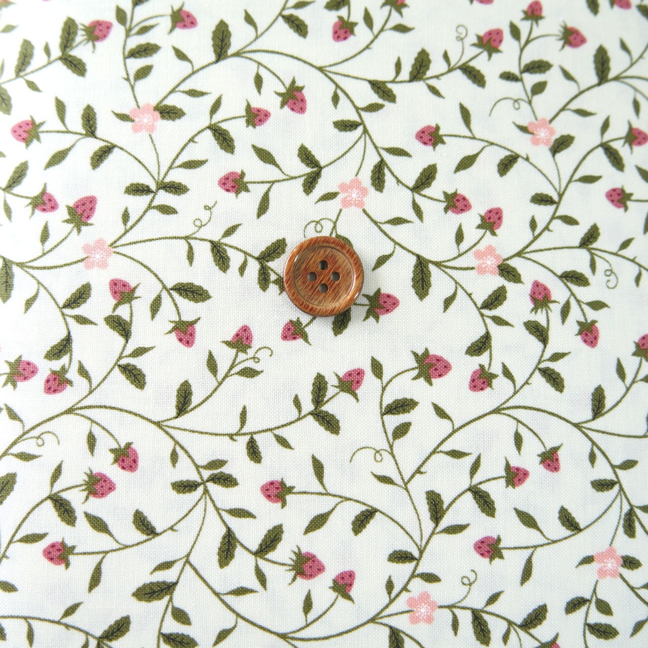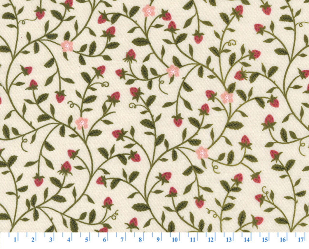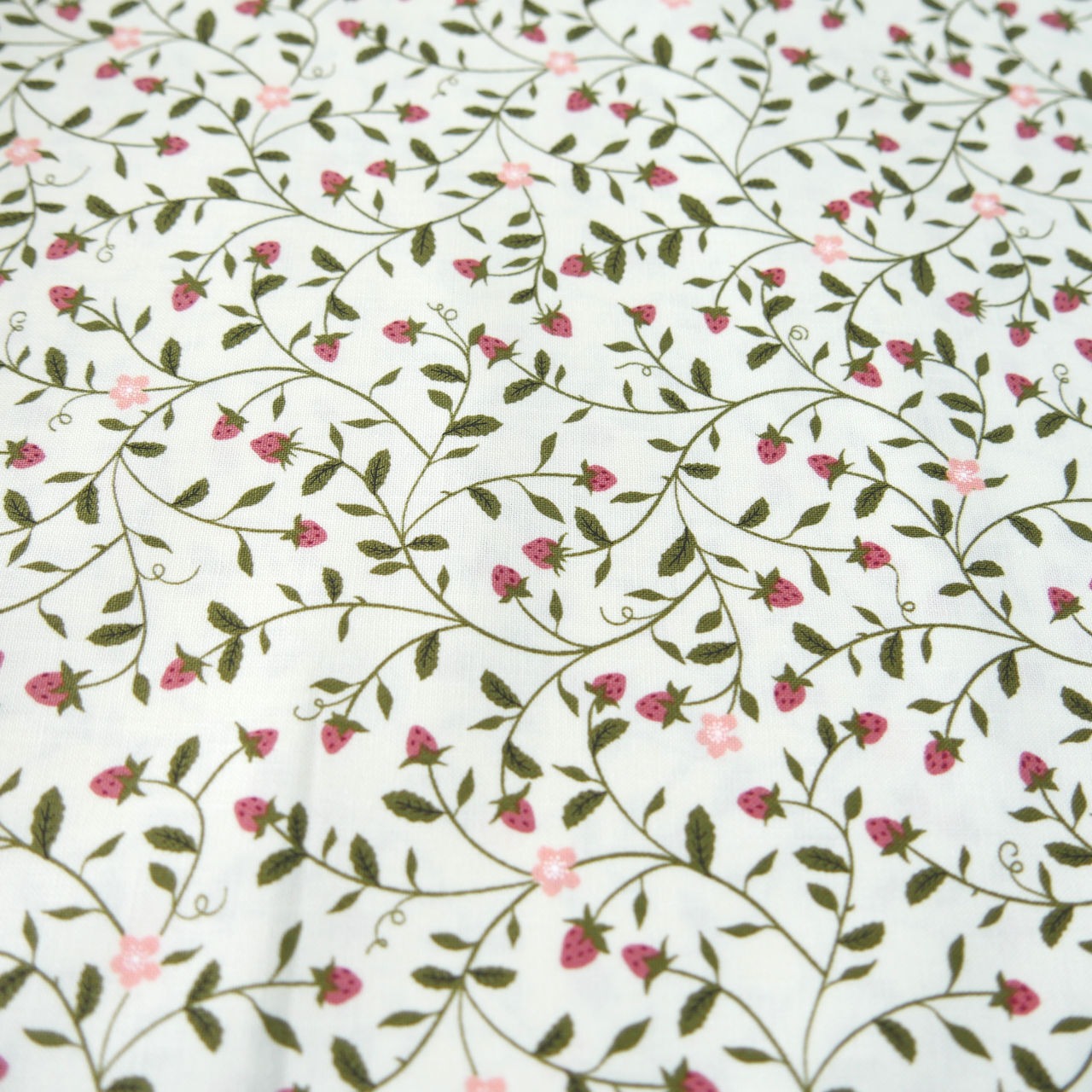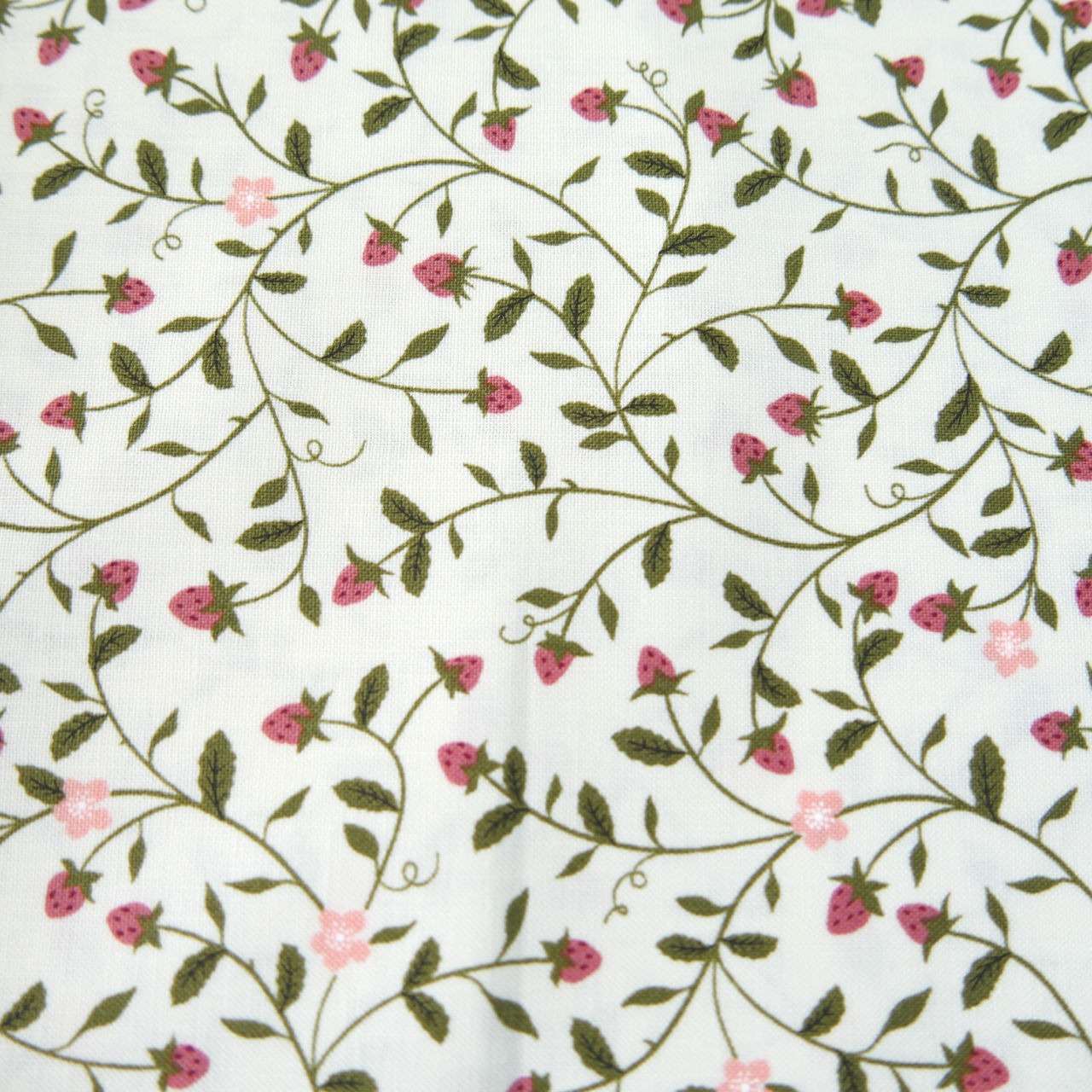 ・moda 2023年10月新作 【Evermore】よりオフホワイト地に緑の葉っぱと小さな木苺が沢山描かれた可愛い生地です。
