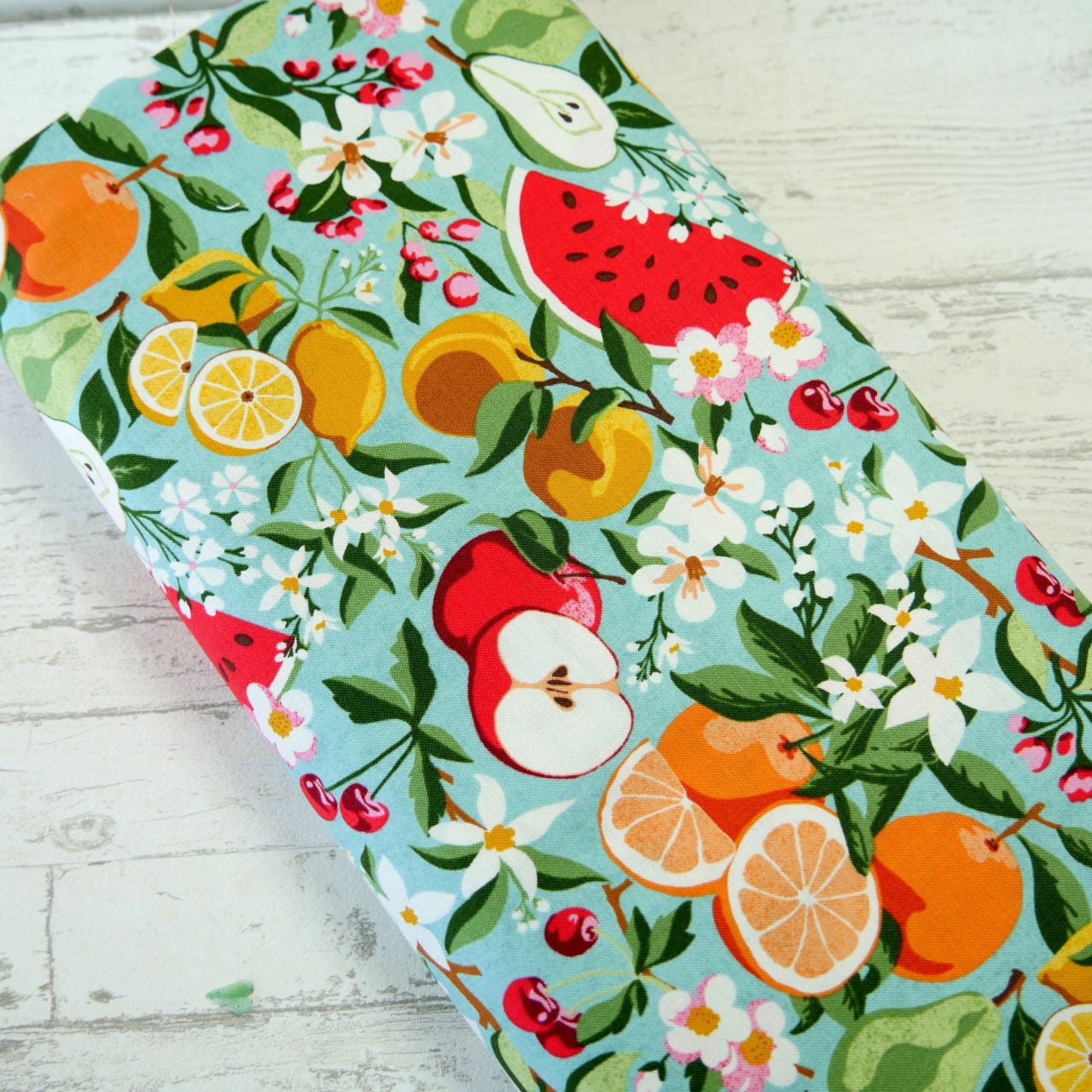 ・2023年11 月新作 moda 【フルーツループ】よりエメラルドグリーン地にカラフルなフルーツ柄の生地になります。