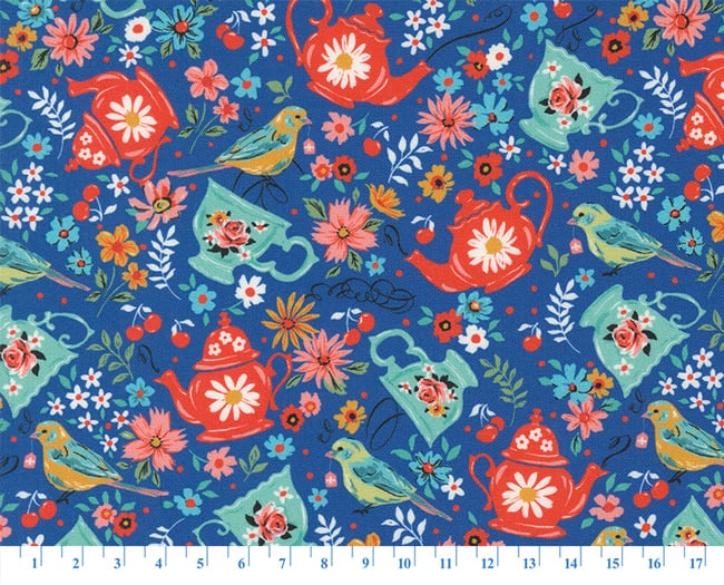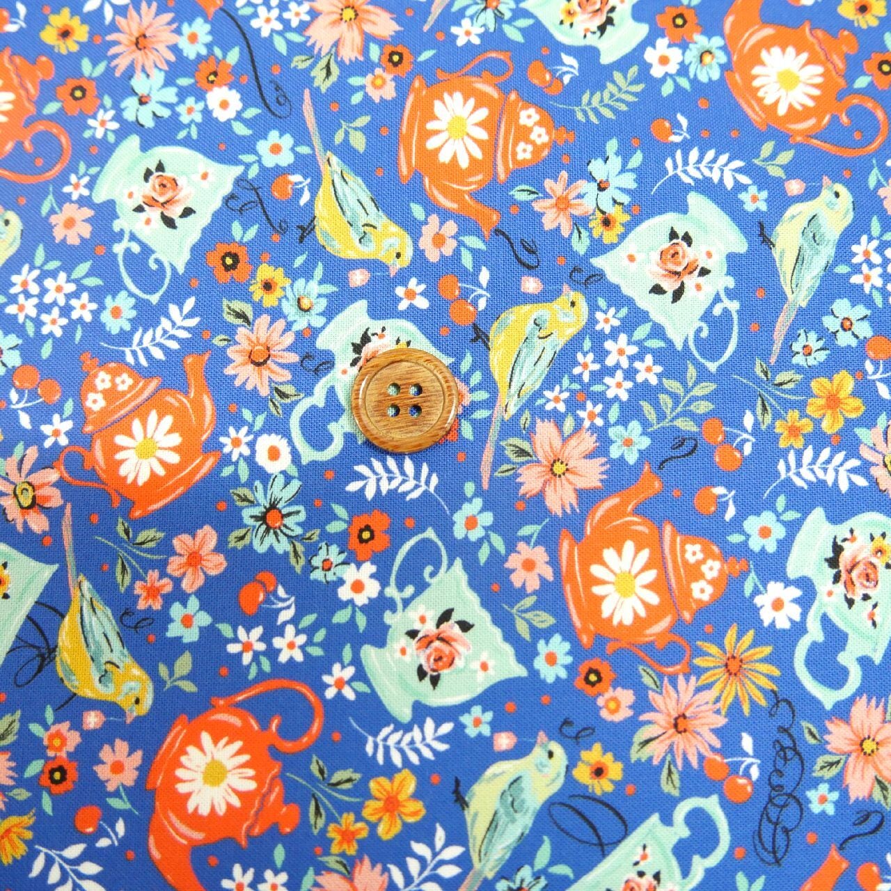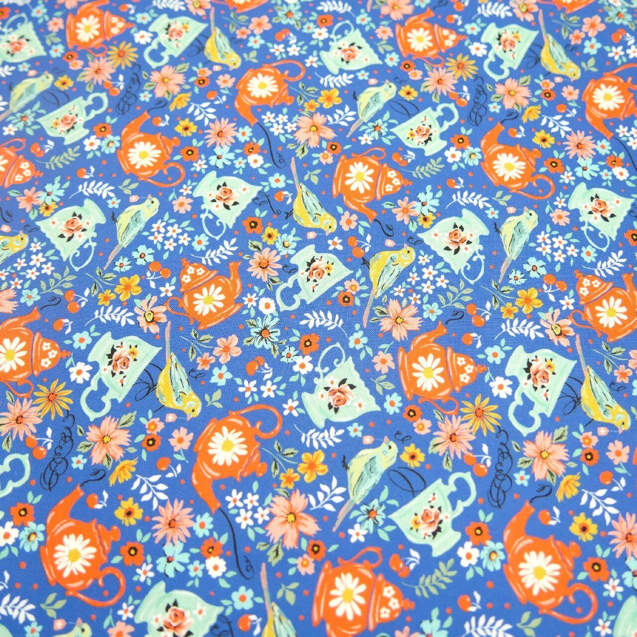 ・青地にカップやポット、小鳥やお花・・見ているだけで楽しくなる生地です