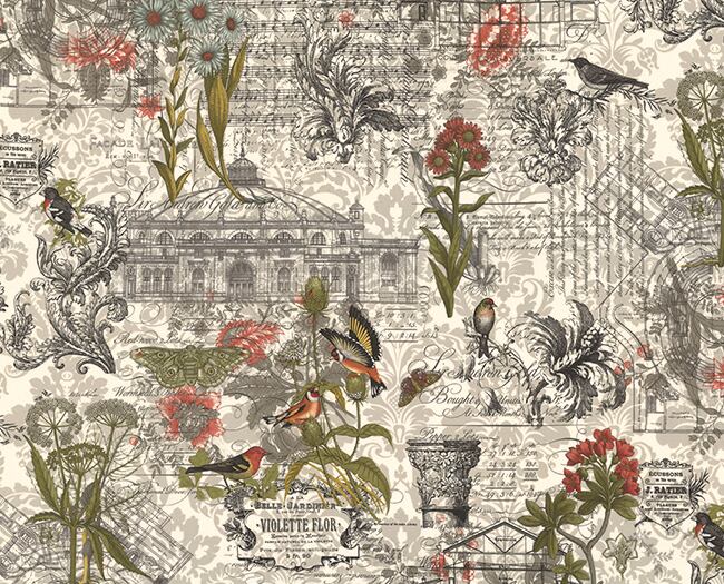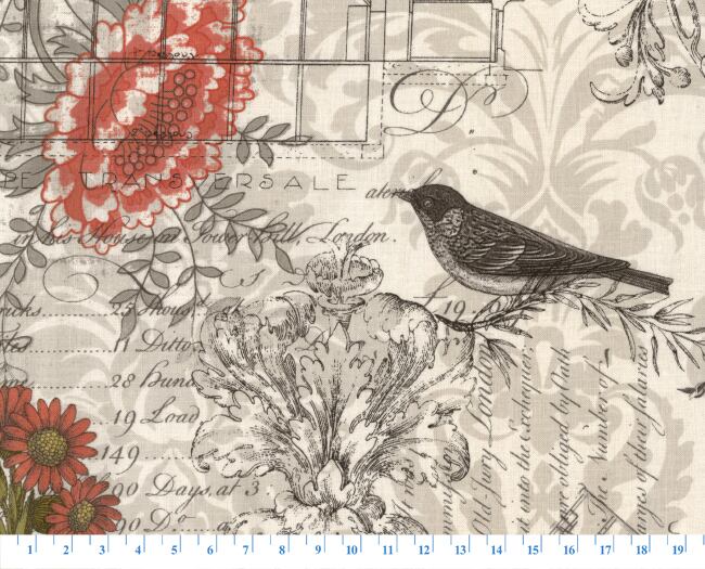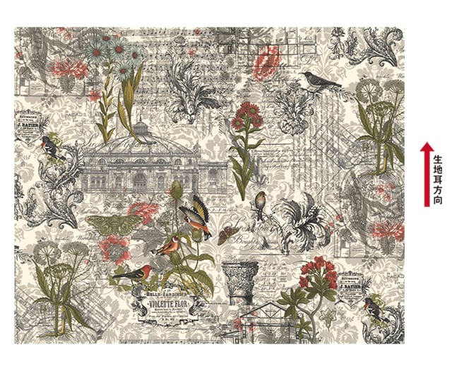 ・グレーを基調に英字が刻まれた地模様に、小鳥、蝶、お花が美しいボタニカルな生地です