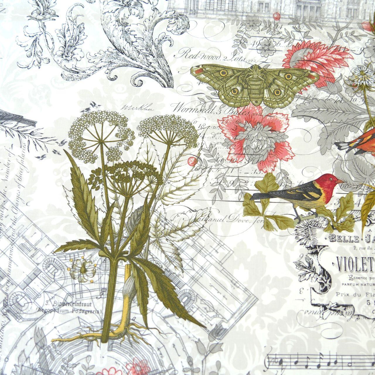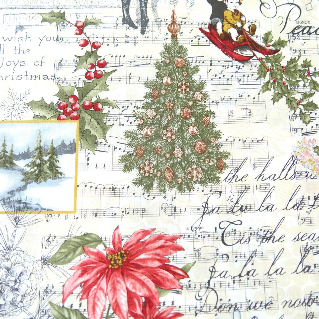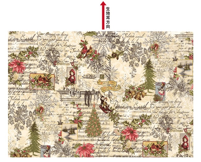 ・ベージュを基調に英字、女の子、クリスマスツリーなどの模様がコラージュされたとても魅力的な生地です
